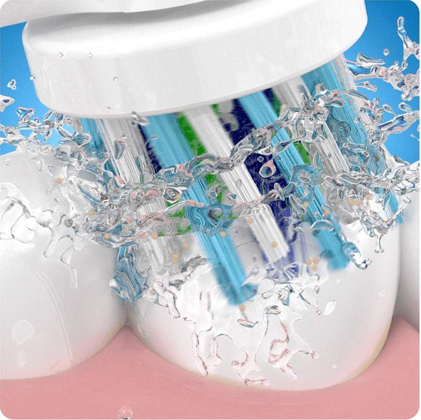 Bàn chải điện Oral-B Vitality CrossAction White được trang bị công nghệ làm sạch 2D với các chuyển động, dao động xoay tròn có tốc độ quay là 7200 vòng/phút, giúp tiêu diệt các mảng bám cứng đầu trên răng. Ngoài ra, đầu bàn chải CrossAction sẽ giúp làm sạch 100% các vết ố trên răng và thức ăn dư thừa nhờ vào lông bàn chải có thể nghiêng đến 16 độ, chạm đến những khu vực khó tiếp cận, giúp chải răng hiệu quả hơn khi so với bàn chải đánh răng thông thường.
