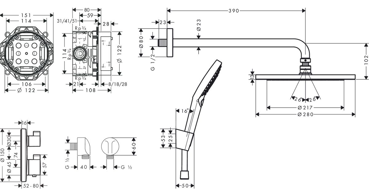 - sen tắm, tay sen, bộ trộn ổn nhiệt, bộ phận giấu, kết nối ống, giá đỡ vòi sen, bao gồm vòi sen