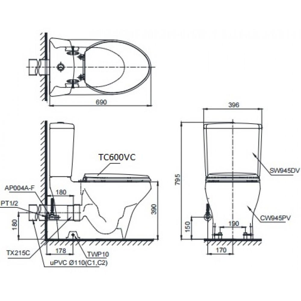 Thông số kỹ thuật bàn cầu TOTO CS945PDT8