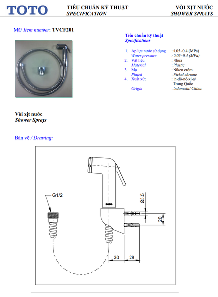 Vòi xịt sử dụng chất liệu nhựa mạ Niken - Crom bền vững với thời gian. Phần dây dài 1,2m có khả năng chịu áp lực nước tốt, dây xịt bàn cầu TOTO TVCF201 giúp người dùng dễ dàng thao tác khi sử dụng.
