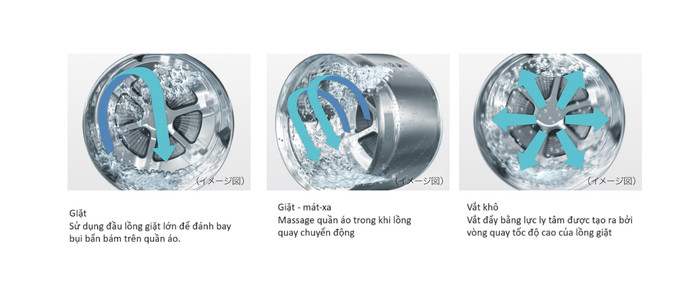 + Một lượng gió với công suất 4,6 m3/phút sẽ được đưa vào lồng giặt