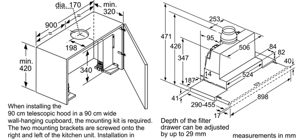 Máy hút mùi Bosch DFS097A50B được lắp vào một vị trí âm tủ bất kì trong bếp. Để vận hành thiết bị này, bạn có thể kéo phần mặt phẳng ra để mở rộng bề mặt tiếp xúc. Với loại máy hút mùi này, mặt trước của máy hút mùi Bosch DFS097A50B có thiết kế đơn giản, dễ dàng hòa hợp với các thiết bị nhà bếp khác.