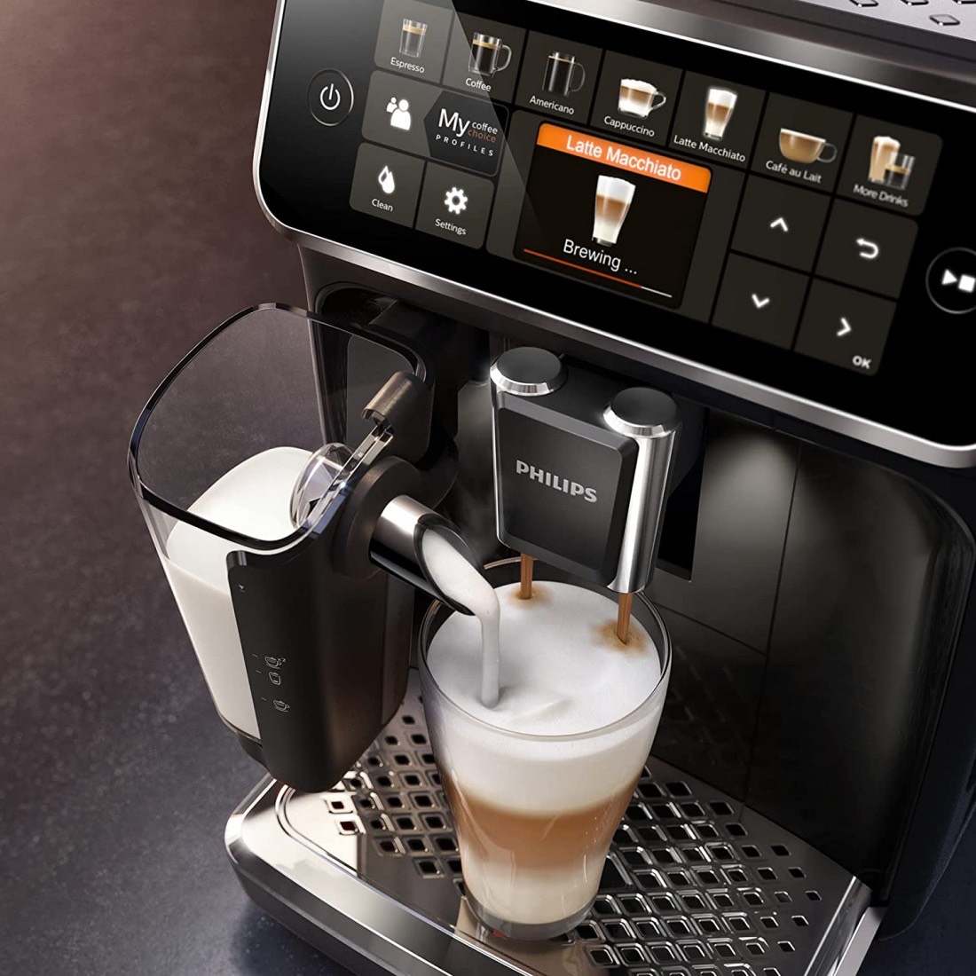 Máy pha cà phê Philips series 5400 có chức năng tự động hoàn toàn từ hạt đến cà phê espresso cũng như cappuccino. Ngoài những nút nhấn về cà phê, chúng ta có thể khám phá cả một thế giới rộng lớn về thức uống với sữa như Caffeelatte, Latte Machiato, Flat White and Milk, bạn có thể dễ dàng lựa chọn những thức uống theo ý thích của mình. Với quy trình pha chế thông minh cho phép thưởng thức hương vị thơm ngon và cà phê ở nhiệt độ tối ưu từ cốc đầu tiên giúp bạn được thưởng thức những ly cà phê trọn vị nhất.