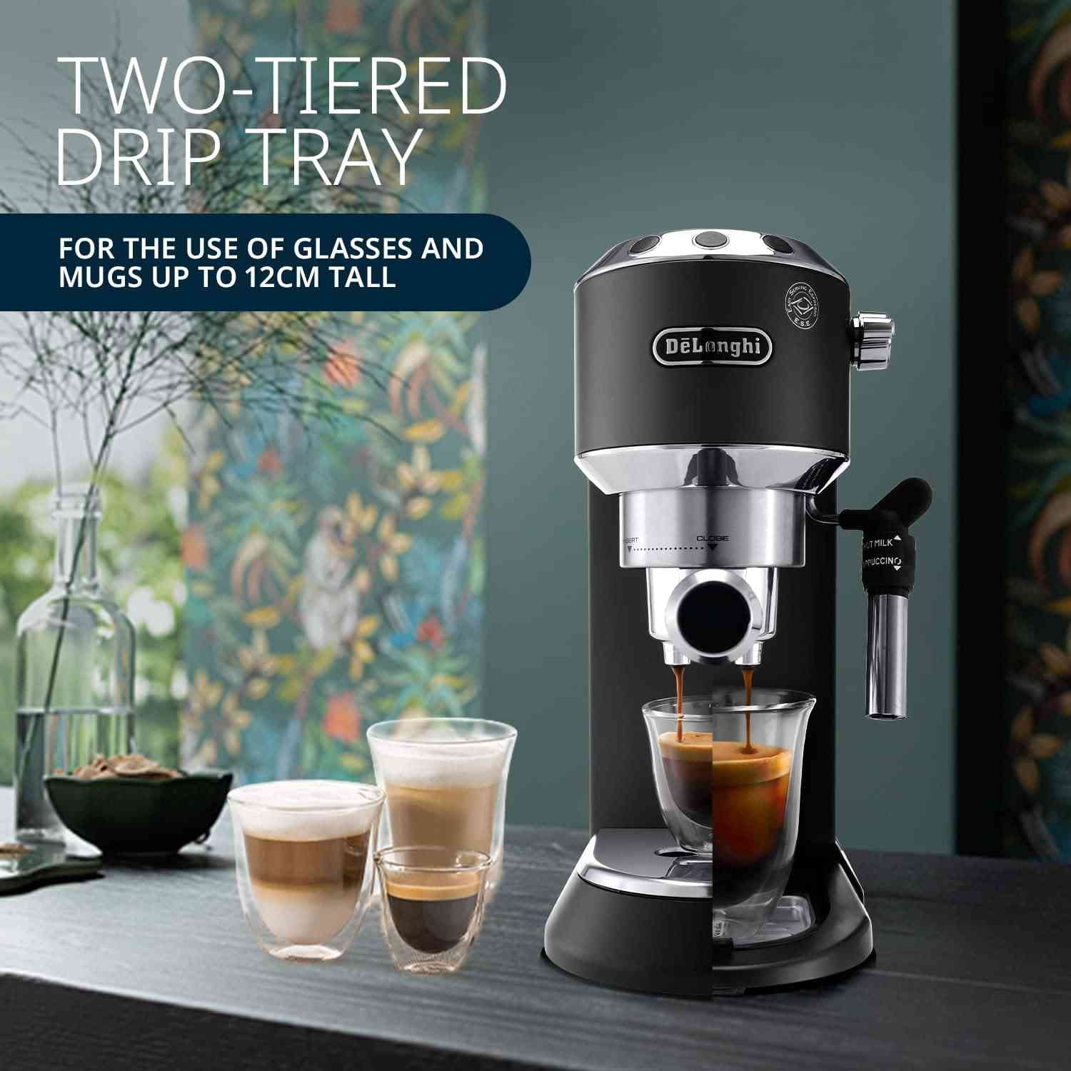 Máy Pha Cà Phê Delonghi Espresso Dedica EC685BK cho phép bạn sử dụng với cốc hoặc ly có chiều cao lên đến 12cm với kết cấu khay nhỏ giọt có thể thay đổi linh hoạt khi sử dụng.