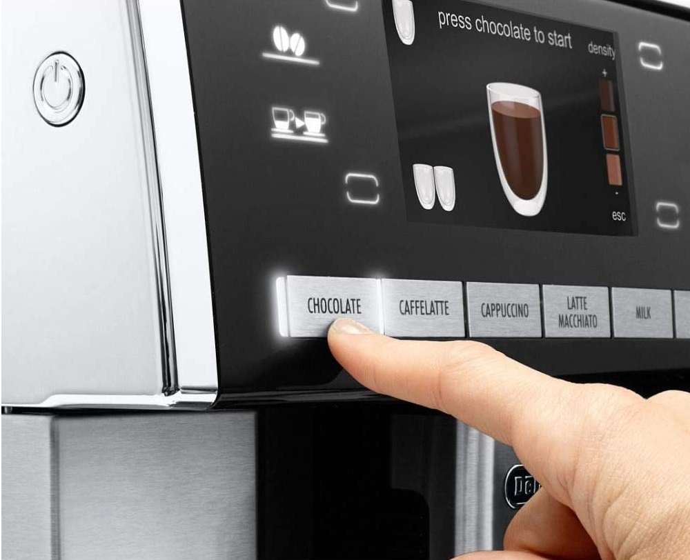 - Nhờ ứng dụng công nghệ độc quyền về hệ thống Cappuccino tự động (công nghệ cảm ứng), DeLonghi Esam 6900 cho phép bạn pha chế các loại đồ uống như Espresso, Cappuccino, Latte, Macchiato, Long coffee, sữa nóng và socola chỉ với 1 lần bấm nút. Với chiếc máy pha chế tự động này thì muốn thưởng thức tách socola nóng, bạn hãy cho sữa vào bột socola vào bình chứa thiết kế riêng của máy và nhấn nút chức năng tương ứng, ngoài ra, có thể thêm chất làm đặc giúp socola sánh và đậm hơn.
