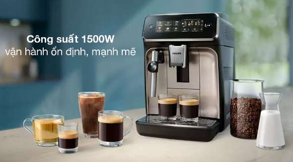 Với mức công suất tiêu thụ điện năng là 1500W, máy pha cà phê tự động Philips EP3321/40 Series 3300 vận hành ổn định, mạnh mẽ, pha chế cà phê nhanh chóng mà vẫn đảm bảo hương vị chuẩn như công thức bạn chọn cùng mùi thơm đặc trưng đầy quyến rũ.