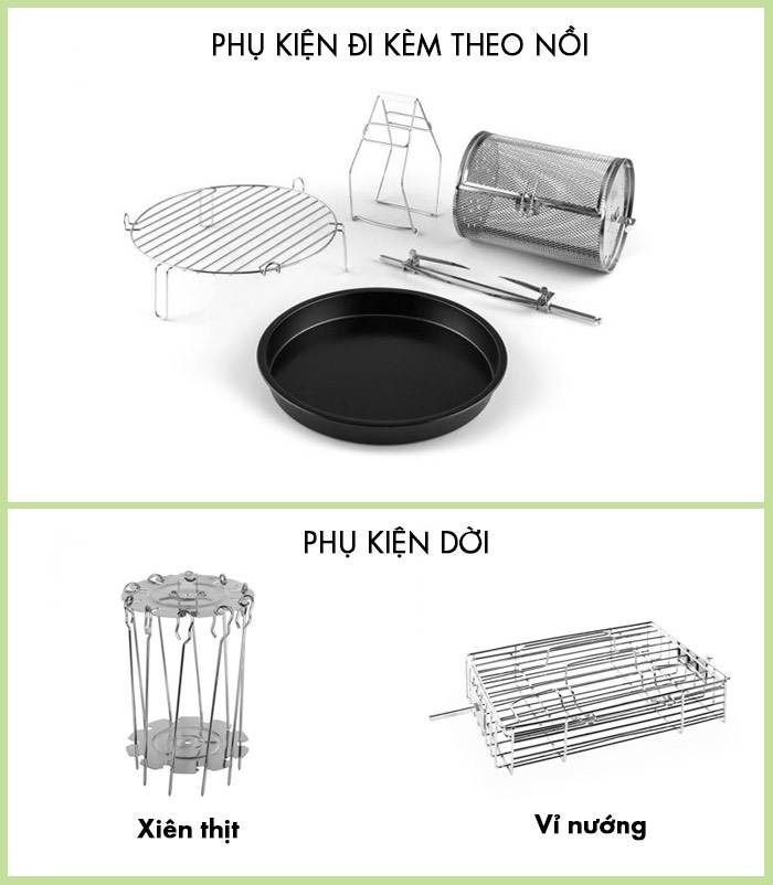 Cho phép chiên không dầu thịt, cá, gà nguyên con hoặc nướng bánh, thịt, khoai tây, rau củ