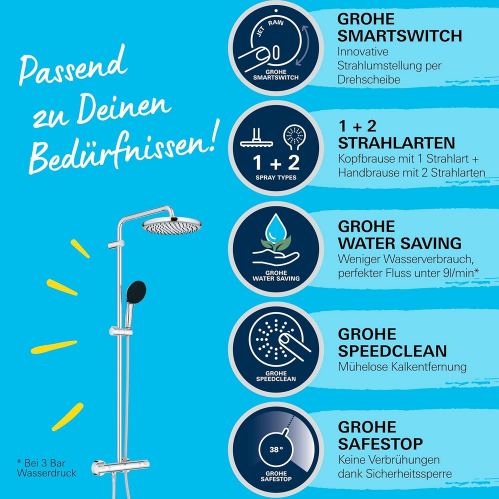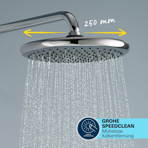 GROHE Vitalio Start System 250 (mã 26677001) là hệ thống sen cây cao cấp treo tường, tích hợp đầu sen tròn 250 mm, tay sen Vitalio Start 110 mm hai chế độ phun, van nhiệt độ Thermostat và nhiều công nghệ độc quyền từ GROHE. Đây là lựa chọn hoàn hảo cho không gian phòng tắm hiện đại, mang lại trải nghiệm tắm thư giãn, an toàn và tiết kiệm nước.
