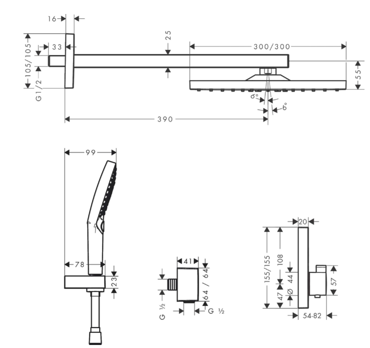 - Bộ sản phẩm bao gồm: Sen trần vuông 300 x 300 mm, tay sen, dây sen 1.25 m, giá đỡ tay sen, van trộn nhiệt ShowerSelect, bộ âm tường và phụ kiện lắp đặt.