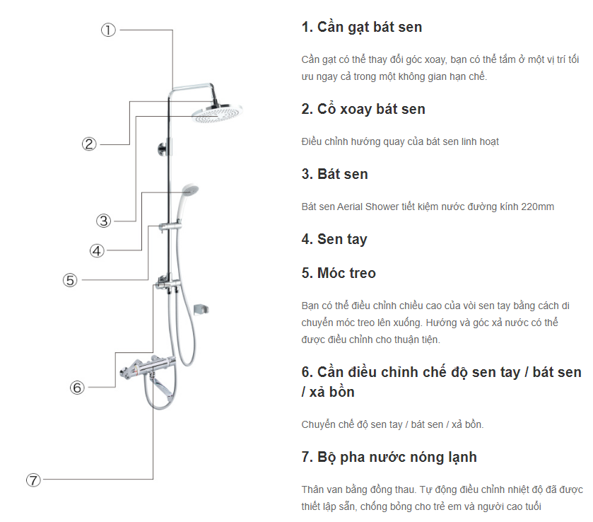 Mức vặn chọn nhiệt độ nước của sen tắm luôn ổn định, không thay đổi. Trên thân van có chốt an toàn chống bỏng, khi muốn mở nước ở nhiệt độ trên 40°C, thì phải nhấn chốt, tránh vô tình vặn vào vùng nước quá nóng.