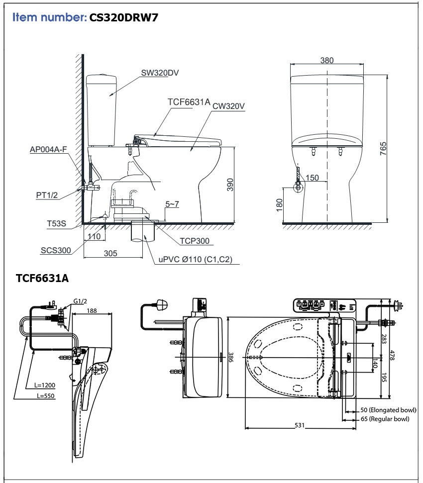 Thông số kỹ thuật bàn cầu TOTO CS320DRW7