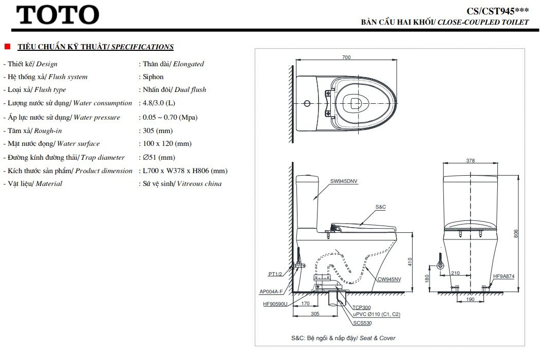Thông số kỹ thuật bàn cầu TOTO CS945DNE4