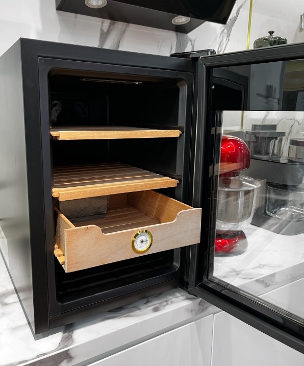 Trong nội thất 37 lít, ba mức lưu trữ và ngăn chứa làm bằng gỗ tuyết tùng cung cấp nhiều không gian cho xì gà của bạn: tiếng ồn thấp, làm mát tối ưu và theo dõi độ ẩm tối ưu.