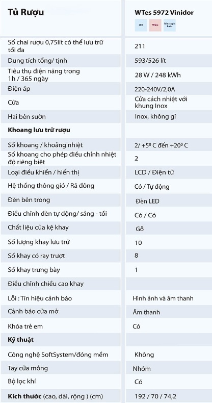 Tủ bảo quản rượu vang Liebherr WTES 5972 Vinidor có hai vùng nhiệt độ riêng biệt độc lập và cộng thêm màn hình LCD, có thể điều chỉnh khoảng từ + 5 ° C đến + 20 ° C một cách linh hoạt cho từng loại rượu như vang đỏ, vang trắng hoặc sâm banh. Liebherr WTES 5972 Vinidor mang lại sự linh hoạt hơn với hai ngăn rượu để lưu trữ và cung cấp điều kiện nhiệt độ lý tưởng. Mỗi loại rượu cần có một mức nhiệt độ thích hợp để có thể phát triển và giữ lại hương vị toàn vẹn của một chai rượu vang sang trọng.