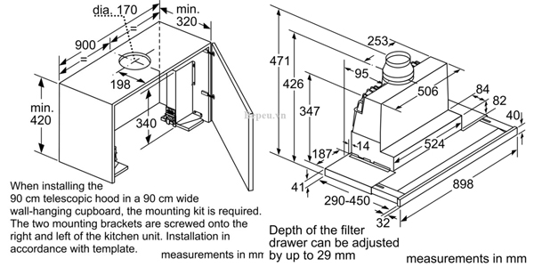 Máy hút mùi âm tủ Bosch DFS097J50B series 8 là dòng sản phẩm cao cấp đến từ thương hiệu Bosch đình đám mà quê hương chính là Cộng Hòa Liên Bang Đức – nổi tiếng với các sản phẩm chất lượng, có giá trị sử dụng cao. Máy hút mùi âm tủ Bosch DFS097J50B được cấu tạo bằng chất liệu thép không gỉ, giúp luôn giữ được vẻ sáng bóng dù đã qua nhiều năm sử dụng. Đồng thời, sản phẩm được đánh giá là một trong những loại máy hút mùi âm tủ tốt nhất, có công suất hút lớn nhưng độ ồn lại cực kỳ thấp và tiết kiệm năng lượng. Dù lắp đặt ở bất kỳ vị trí nào, máy hút mùi Bosch DFS097J50B cũng sẽ luôn mang lại cảm giác tuyệt vời nhất cho người sử dụng và làm nổi bật thêm không gian bếp của gia đình bạn.