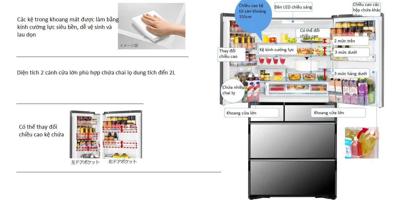 Với Hitachi R-WXC74T dung tích tủ là 735L, bạn có thể chọn dung lượng lớn hơn tùy theo không gian lưu trữ của mình và gần như đây là phân khúc và kích thước được dùng nhiều nhất. Các vật chứa cao như chai lọ có thể được bảo quản thẳng đứng trên giá đầu tiên của tủ lạnh Hitachi R-WXC74T. Bạn có thể sử dụng nó đúng cách với túi cửa để đựng nhiều chai lọ và sắp xếp chúng một cách hợp lí theo ý thích của bạn. Ngoài ra tất cả các kệ trong ngăn mát tủ lạnh đều có khả năng chống trầy xước vì được làm bằng kính cường lực cao cấp, dễ dàng lau chùi vệ sinh.